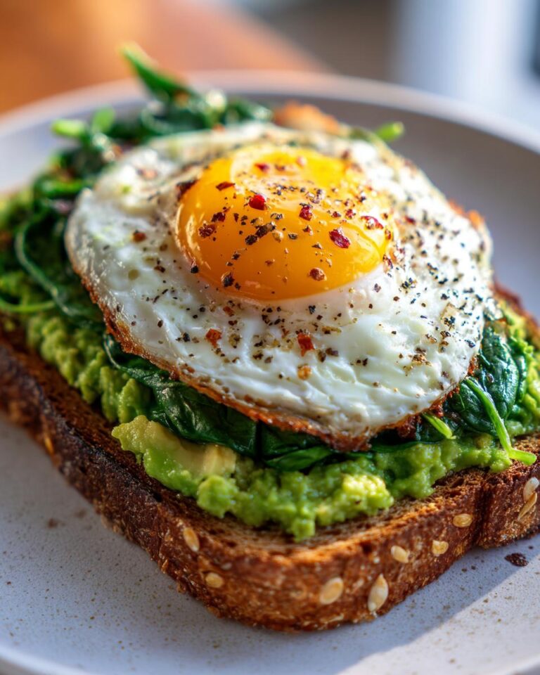 Okay, the fun part! Spread that creamy avocado mash on your toast. Top it with your perfectly cooked egg. Then, pile on those fresh greens! Finally, sprinkle with a little more salt, pepper, and those red pepper flakes if you’re feeling it. And that’s it! You’re ready to dig in and enjoy your super-delicious and healthy breakfast!