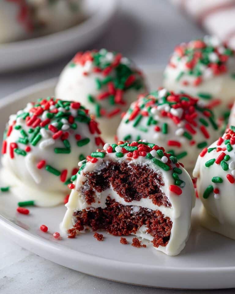 Okay, time for the fun part! Take your chilled truffle balls out of the fridge. Grab one, dip it into the melted white chocolate, and use a fork or a toothpick to help coat it all over. Let any excess chocolate drip back into the bowl. Immediately after dipping, place the coated truffle back onto your parchment-lined baking sheet. While the chocolate is still wet, sprinkle it with your red and green sprinkles! You’ve got to work pretty quickly here so the sprinkles stick before the chocolate starts to set.