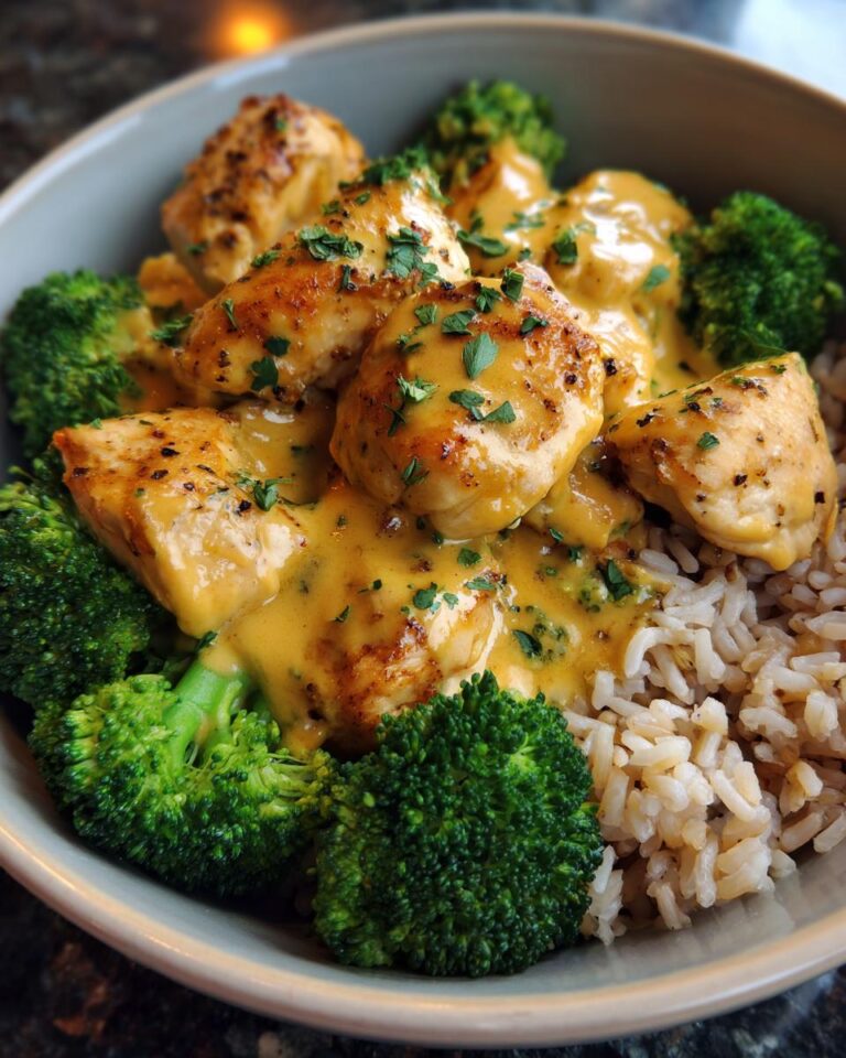 Alright, the grand finale! Add the cooked chicken back into the sauce, so it gets all coated. Steam your broccoli florets until they’re tender-crisp. Now, in a bowl, layer your cooked brown rice, top it with that saucy chicken, and add those beautiful broccoli florets. And there you have it, your perfect **Creamy Dijon Chicken & Brown Rice Bowl** is ready to devour! Enjoy!