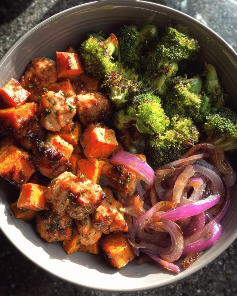 Okay, the fun part! Once the sweet potatoes are tender and the chicken is cooked, assemble your bowls. Divide the roasted sweet potatoes, broccoli florets, and red onion between your bowls. Slice the chicken and arrange it on top of the sweet potatoes. Drizzle any extra glaze from the pan over the chicken and veggies. And that’s it! You’ve got yourself a beautiful, healthy, and incredibly tasty **Maple Dijon Chicken Sweet Potato Bowl** ready to enjoy!
