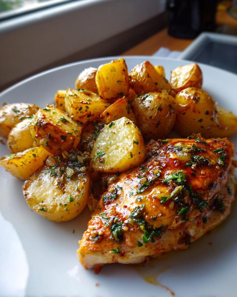 A simple one-pan dish featuring flavorful garlic butter chicken and roasted potatoes.