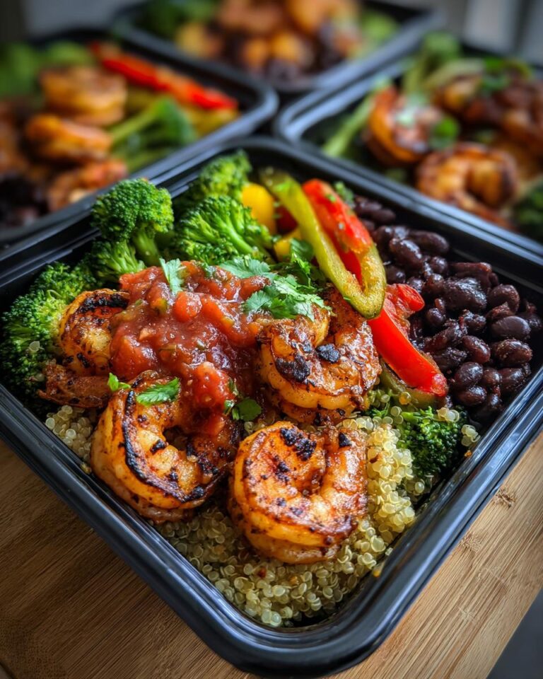 Once the shrimp are cooked, it’s assembly time! This is where you get to unleash your inner artist. Grab your meal prep containers and let’s get layering. First, divide the cooked quinoa evenly between your containers. Next, add your mixed veggies and black beans. Then, top everything off with those gorgeous grilled shrimp. Finally, add a dollop of salsa! And that’s it! You can store these in the fridge for up to four days. And that is a delicious **shrimp bowl** that is also a **healthy dinner shrimp recipes**!