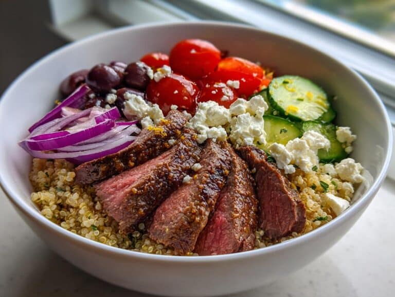 You know those nights when you want something hearty but still want to feel good after eating? That’s exactly how I fell in love with this Healthy Steak Bowl Recipe Inspired by the Mediterranean Diet. After one too many takeout meals left me feeling sluggish, I started playing with fresh ingredients from my local farmers market – think juicy tomatoes, crisp cucumbers, and that gorgeous flank steak on sale. What came together was this magical bowl that’s become my go-to weeknight hero. It’s got all those bright Mediterranean flavors I crave, comes together faster than pizza delivery, and leaves me feeling satisfied without the food coma. Trust me, once you try this combo of tender steak and vibrant veggies over fluffy quinoa, you’ll be hooked too!