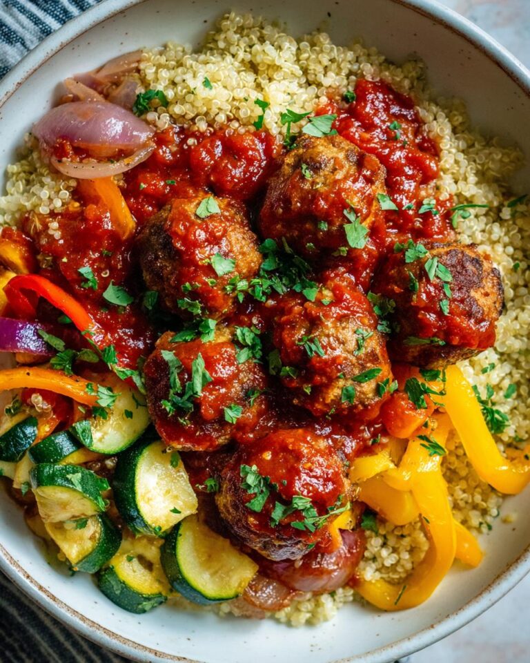 - Meatballs on Top! Spoon a generous portion of the saucy meatballs over the quinoa.