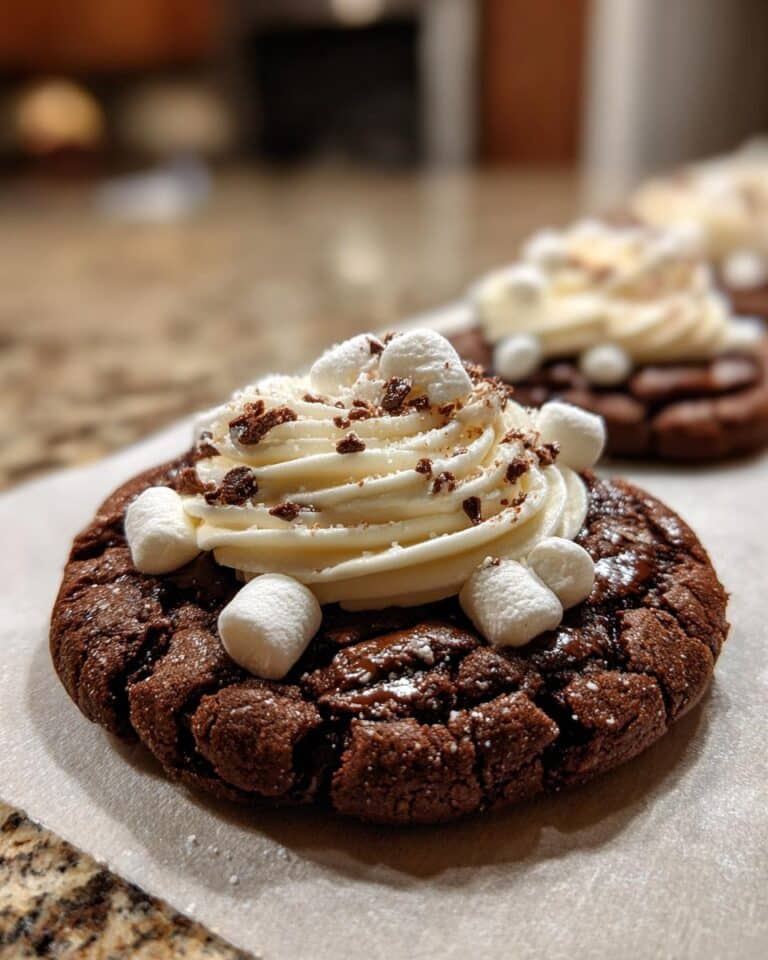 These Hot Cocoa Cookies capture the rich flavor of hot chocolate in a chewy cookie form. They are topped with a swirl of frosting and mini marshmallows, making them a perfect treat for any occasion.