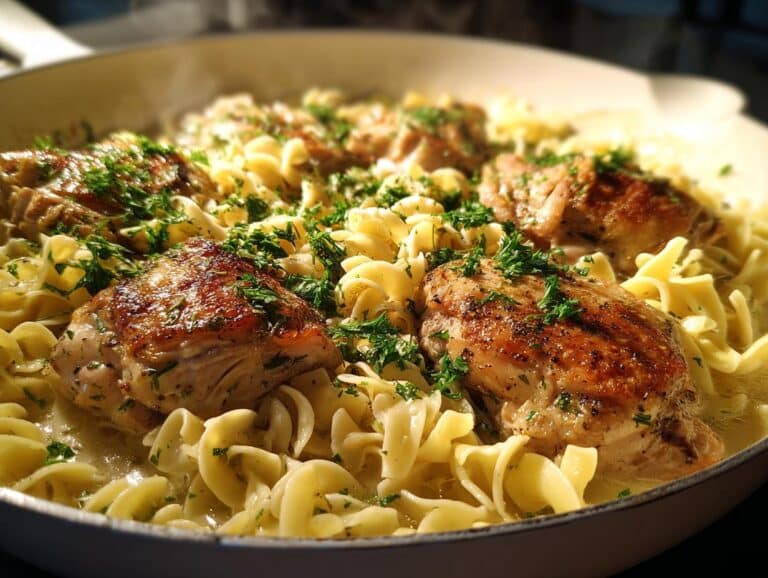 You know those nights when you’re staring into the fridge at 6pm, completely wiped from the day, and takeout sounds way too tempting? Yeah, me too. That’s exactly when my one-pan chicken with buttered noodles swoops in to save dinner. I created this recipe during one of those chaotic weeks when my daughter had soccer practice three nights in a row and my husband was working late. The beauty of this dish? One pan, thirty minutes, and you’ve got golden chicken sitting atop buttery, garlicky noodles that taste like comfort in every bite.
