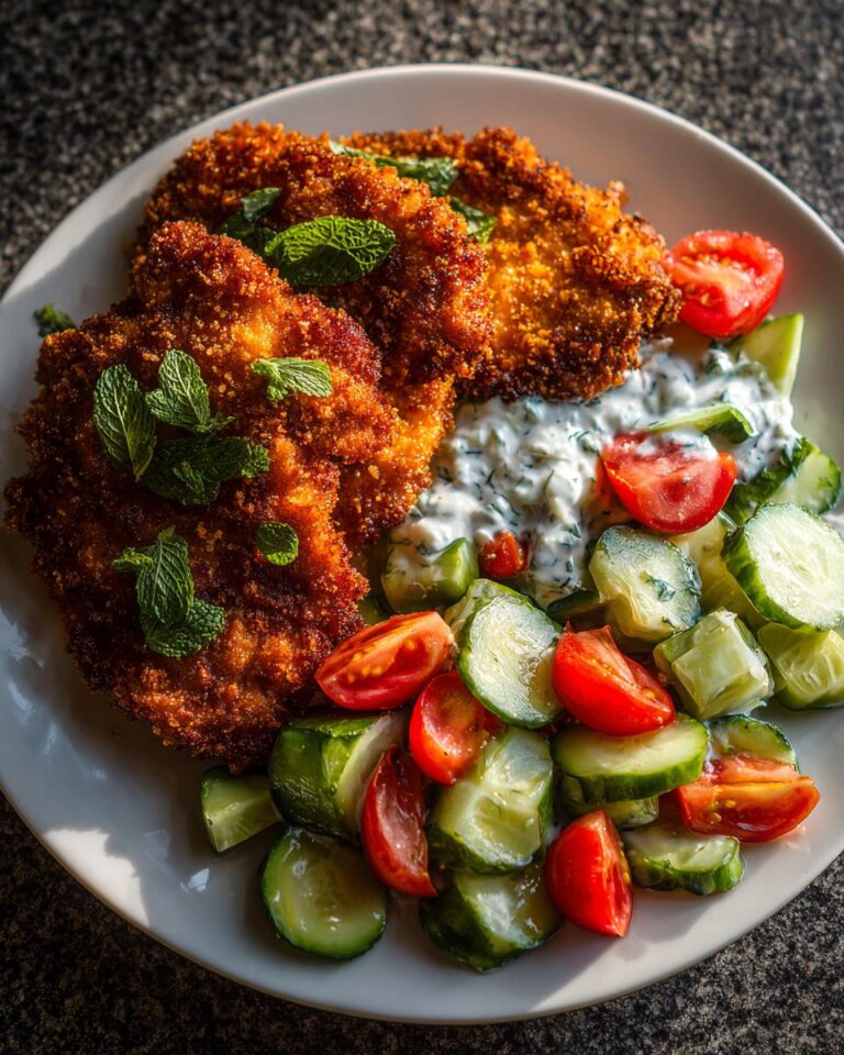 Crispy panko breaded chicken paired with a refreshing cucumber yogurt salad.