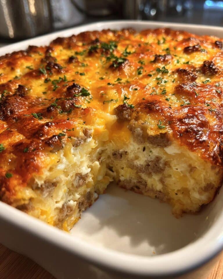 A hearty and satisfying casserole featuring savory sausage, crispy hash browns, and eggs, perfect for a weekend brunch or busy weekday breakfast.