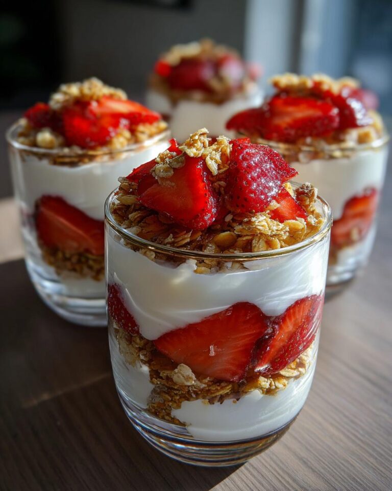 Okay, so here’s what you’ll need to whip up these amazing dessert parfaits. Trust me, it’s super simple! You’ll need about a cup of fresh strawberries, and make sure they’re sliced. Then, grab some vanilla yogurt – any brand you love is fine! Next, a half-cup of your favorite granola. And finally, if you’re feeling extra, some whipped cream for the top!