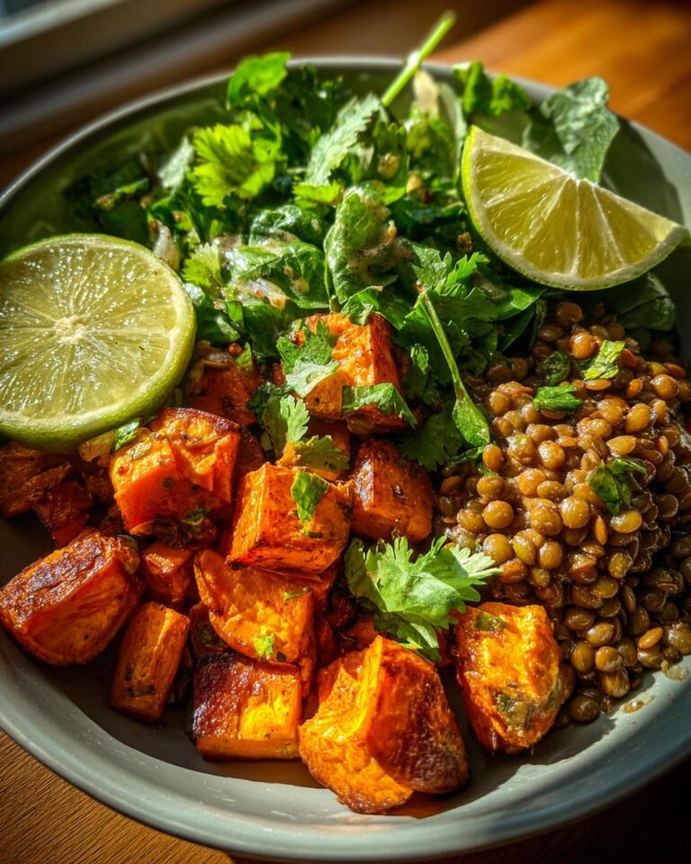 - Assemble bowls: Add lentils, sweet potato, and garnish with cilantro. Serve with lime wedges.