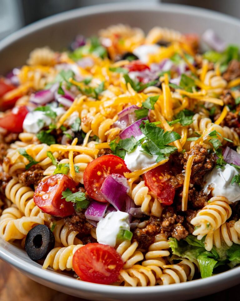 A refreshing and flavorful taco pasta salad. Perfect for a quick meal or a party side.