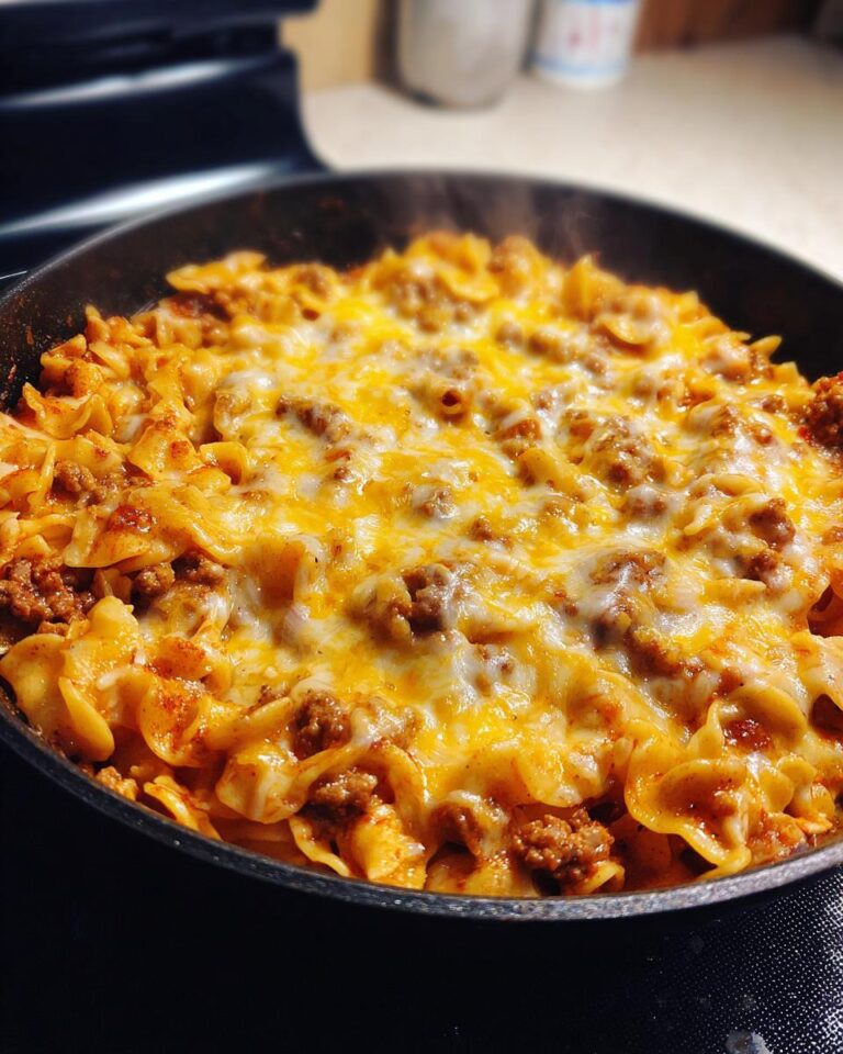 Finally, it’s time to bring it all together! Add your cooked pasta to the skillet with the sauce. Stir everything together to make sure the pasta is coated. Now, sprinkle that glorious cheddar cheese all over the top. Cover the skillet with a lid, and let it cook until the cheese is completely melted and bubbly. Oh my goodness, it’s so good! Serve it right away, and enjoy!