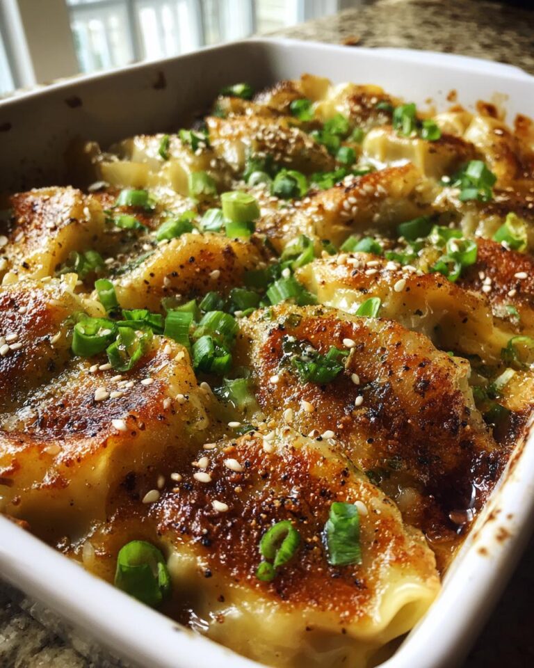 Once it’s out of the oven, it’s topping time! Sprinkle on your sesame seeds, chopped green onions, or whatever toppings you’re using. Let it cool for a few minutes and then serve it up! That’s it, you’re done! Enjoy your amazing **Pot Sticker Bake**!